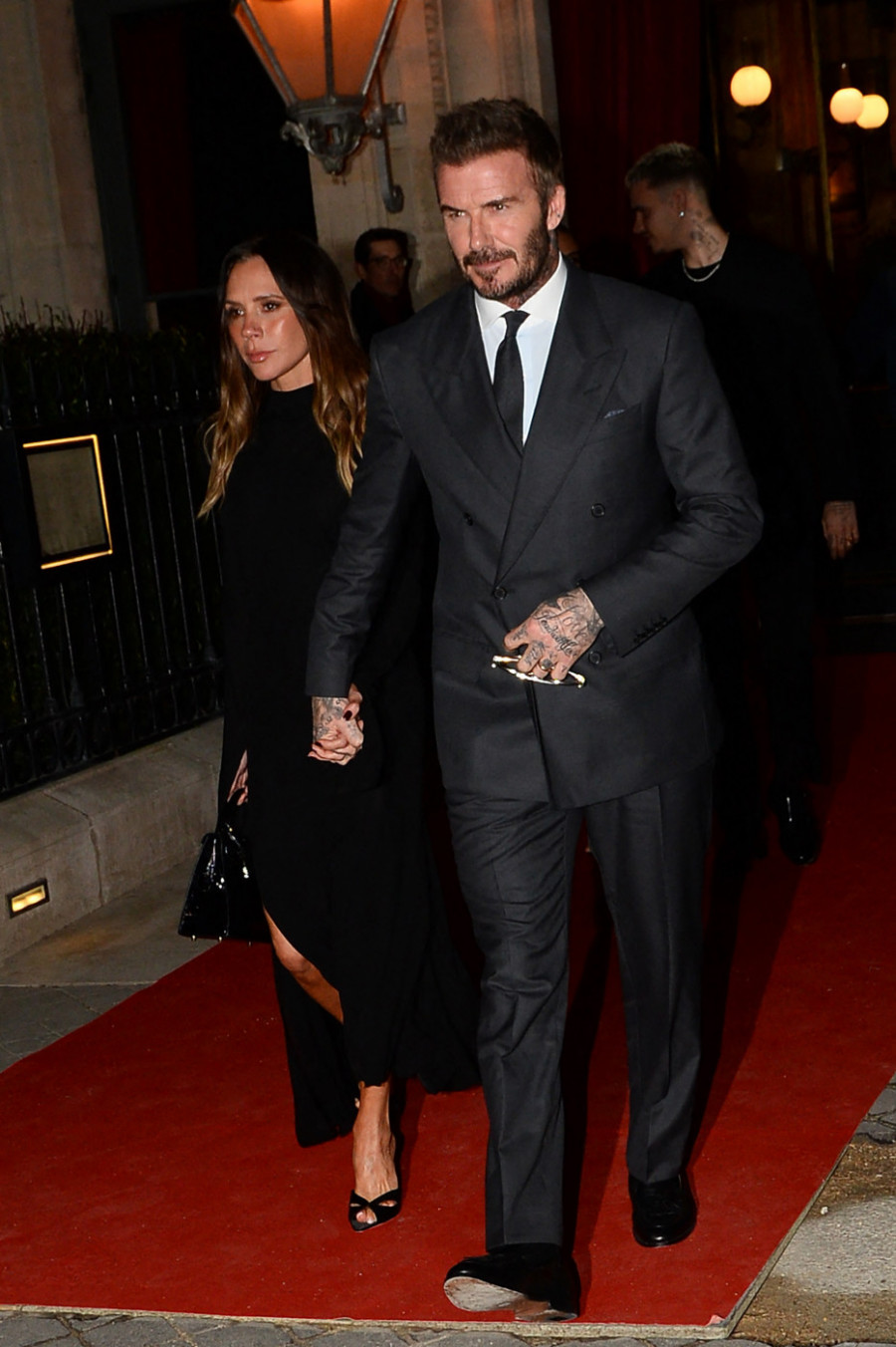 Viktorija Bekam je izašla u francusku prestonicu obučena u crnu haljinu sa visokim ovratnikom i još višim prorezom na nozi. Na nogama je nosila crne špic cipele, a pored nje je stajao suprug Dejvid Bekam. Legenda fudbala izgledala je besprekorno u sivom odelu sa kravatom, beloj košulji i sjajnim crnim cipelama.