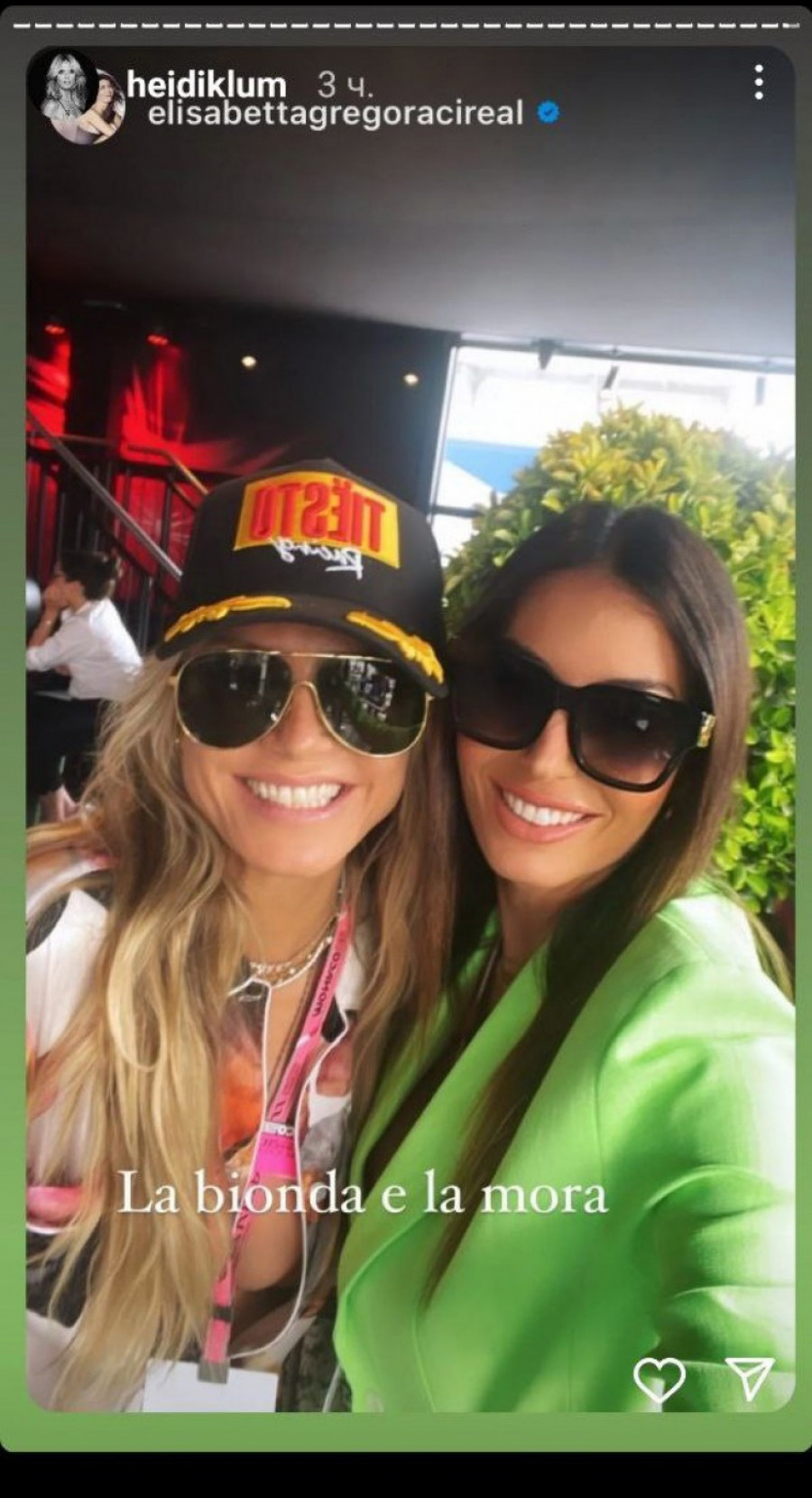 Naime, ona je na svom Instagram storiju objavila sliku sa italijanskom voditeljkom Elizabetom Gregorači, bivšom ženom italijanskog biznismena Flavija Brijatorea i na taj način dokazala da među njima nema „zle krvi“. Dve velike bivše ljubavi bivšeg šefa Formule 1 pozirale su nasmejane jedna pored druge, a sliku je pratio natpis „Plavuša i crnka“ na italijanskom. Hajdi i Elizabeta su pokazale da zajednički bivši ne mora da predstavlja prepreku sadašnjem prijateljstvu.