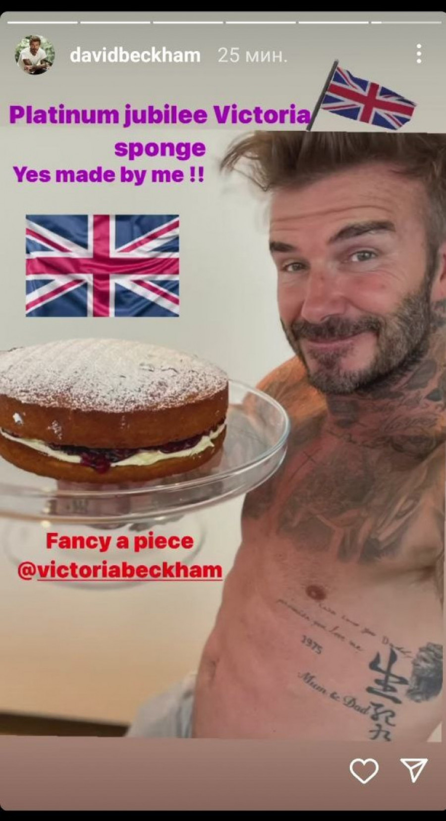 Malo je reći da mnogi nisu mogli da se nagledaju ovog slatkiša, i pritom ne mislimo na tortu. Dejvid Bekam je na poslednjem storiju prikazao sebe kako drži stalak sa dekorisanom tortom, koja je njenih ruku delo. Zgodni poslastičar je tom prilikom pozirao polugo, te na storiju vidimo njegove savršeno isklesane trbušnjake i vragolasti smešak na njegovom licu.