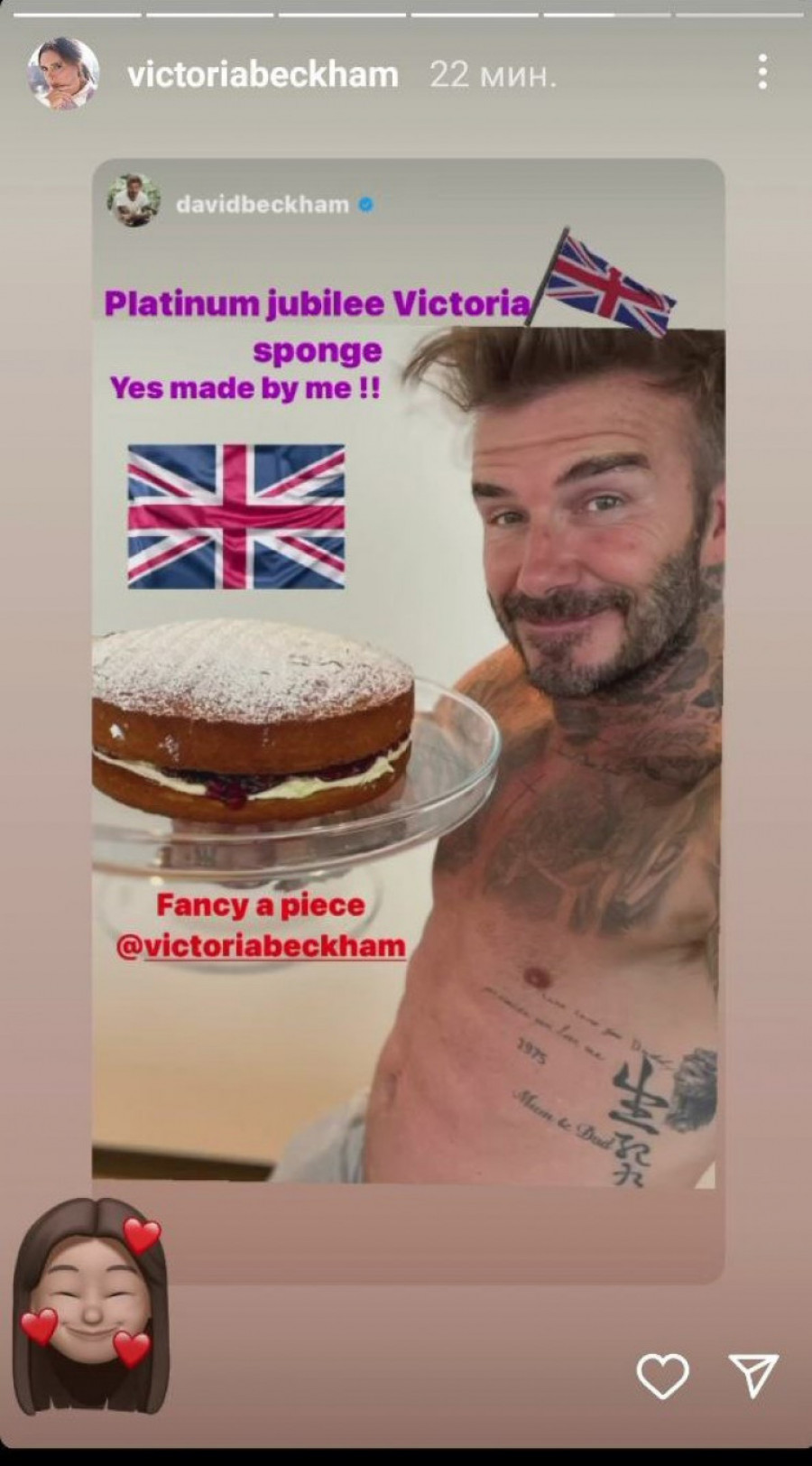 Sliku je pratila i ponuda da svojoj supruzi Viktoriji da parče istoimene torte. Ona naravno nije ostala imuna na ponudu, ali ni na kuvara, te ja na svom Instagram storiju podelila tu istu sliku uz emotikon smeđokose žene okružene srcima. Gospođa Bekam je time pokazala da i nakon 23 godine braka i dalje ne može da odoli svom suprugu.