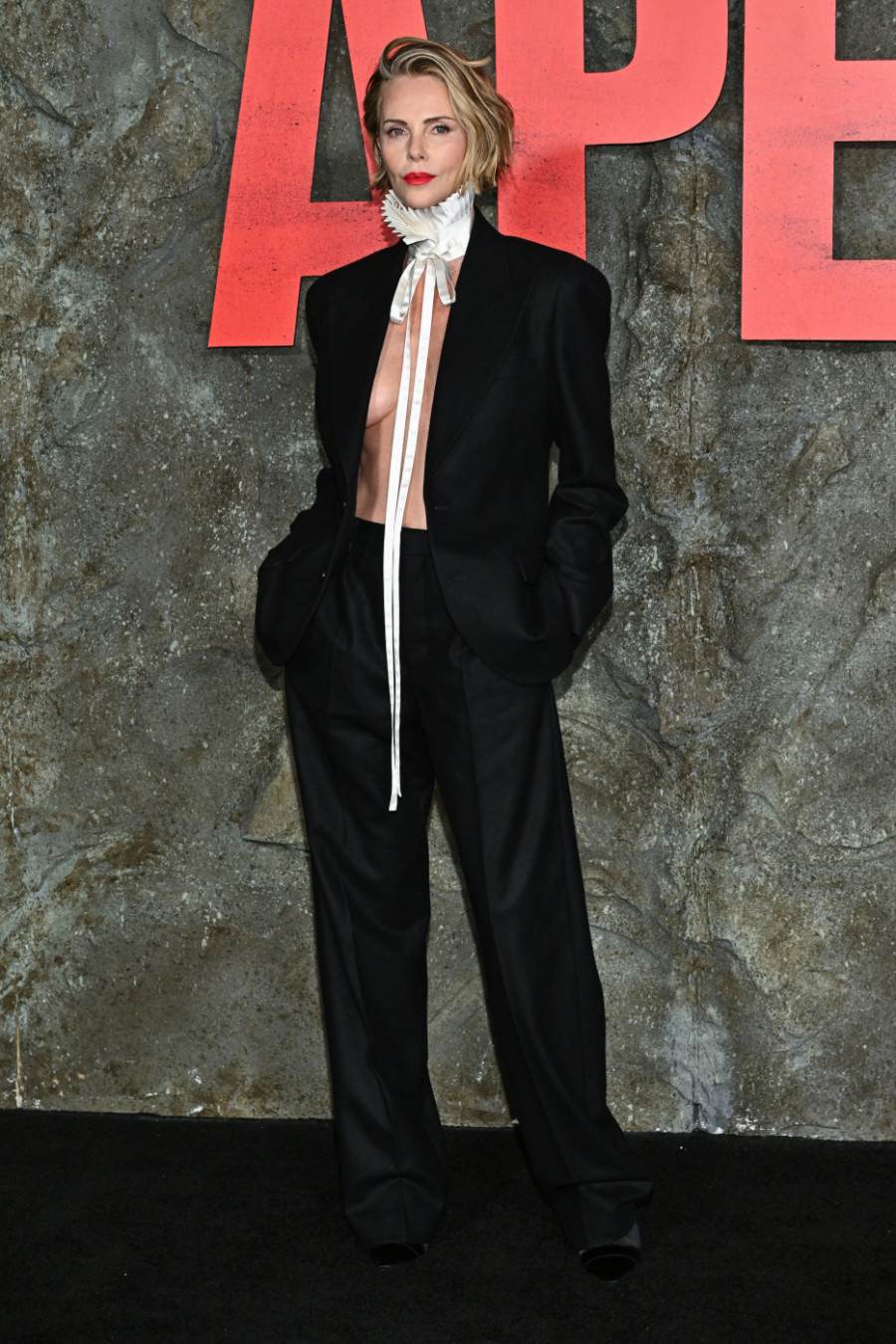 Ipak, ono što je ovu kombinaciju učinilo nezaboravnom jeste detalj koji je pomerio granice. Šarliz ispod sakoa nije nosila apsolutno ništa. Sako je ostavila kompletno raskopčan, pa su se grudi delimično videle, ali dovoljno da bude jasno da ne nosi brushalter.