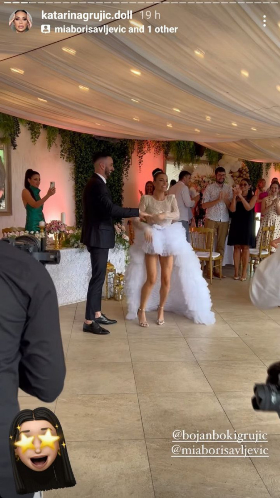 Pevači Bojan Grujić i Mia Borisavljević već duže vreme su skladan par i roditelji dve devojčice, pa je javnost bila iznenađena kada je taj dvojac odlučio da sklopi brak u tajnosti. Taj estradno-emotivni dvojac je nedavno proslavio prvi rođendan i krštenje mlađe ćerke Tee, a istog dana su odlučili i da se jedno drugom zavetuju na večnu ljubav. Portal Srećna Republika vam otkriva kako su novipečeni mladenci izgledali, ko je privukao najviše pažnje na slavlju, ali i šta se tačno dogodilo kada je atraktivna Mia u prekratkoj venčanici odlučila da svog novopečenog supruga časti jednim vrelim plesom. Pritom, sve vreme je je u akciji pratila grupa zgodnih plesačica.
