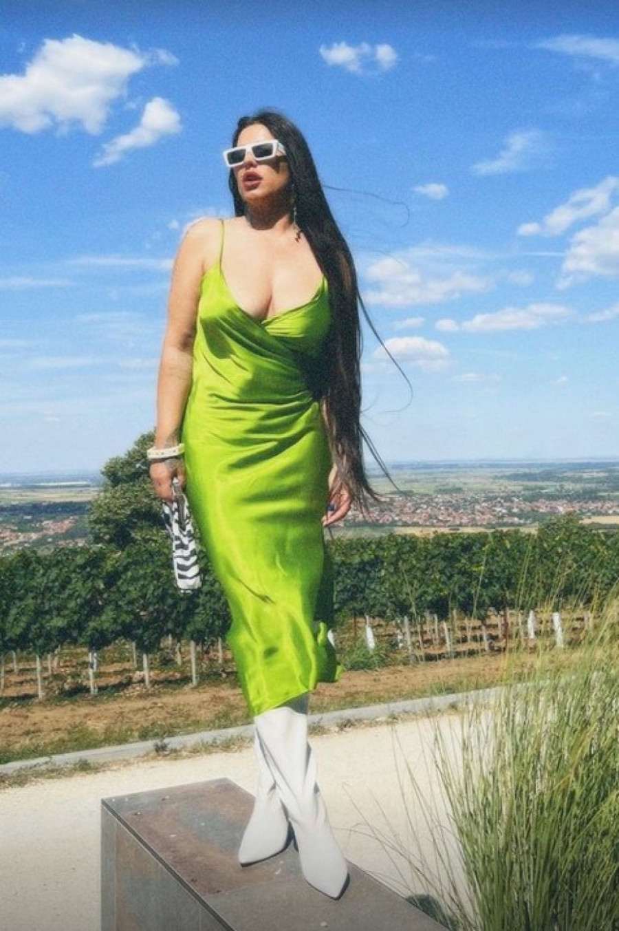 Pevačici Seki Aleksić koja vredno nastupa ovih dana izgleda je dosadila letnja žega, pa je spas potražila na seskom imanju u Negotinu. Seka je svoje pratioce na Instagramu obradovala serijom fotografija u zanosnoj svilenoj haljini najaktuelnije kivi-zelene boje. Haljina je dubokog dekoltea, tankih bretela i srednje dužine, tačnije do upola listova, a ima i veliki šlic sa bočne strane. Seka svakako ima i šta da pokaže u predelu dubokog izereza na grudima, a vidno je da je brushalter tokom trenutnih tropskih vrućina izostao. Haljina je srećom idealna za visoke temperature, a pevačica ju je često i bez bojazni zadizala.