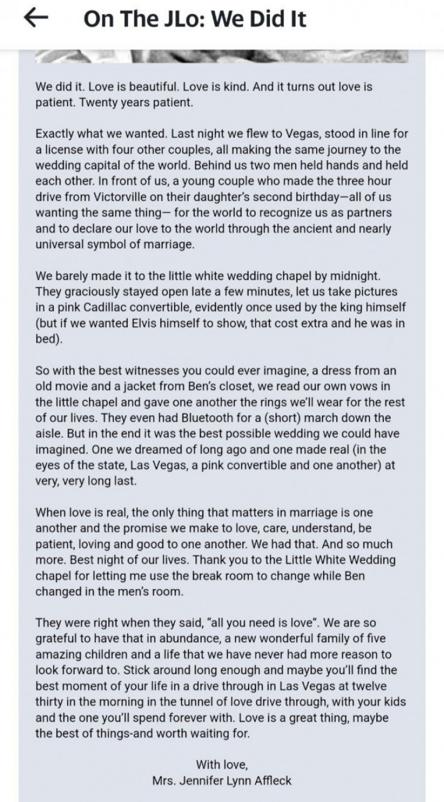 U đemotivnom pismu fanovima, Dženifer je priznala da se udala i naglasila kako je ljubav prelepa, darežljiva i strpljiva, budući da je par tek nakon 20 godina uspeo da izgovori sudbonosno „da“. Da nije stvarnost, mnogi bi mogli pomisliti da je ljubav Džej Lo i Bena Afleka vrhunska romantična komedija.