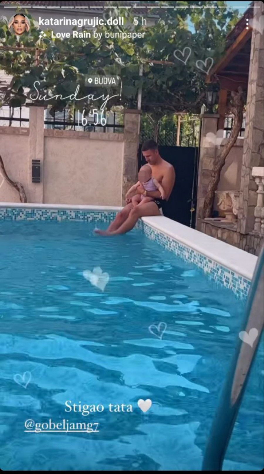 Naime, fudbaler se pridružio svojoj supruzi i ćerkici u Budvi. Prvo je naravno moralo da „padne“ druženje tate i ćerke, te je ponosna mama na svoj Instagram stori okačila snimak preslatkog dvojca kako uživa na bazenu, na kome se vidi kako Gobelja drži svoju naslednicu u krilu.
