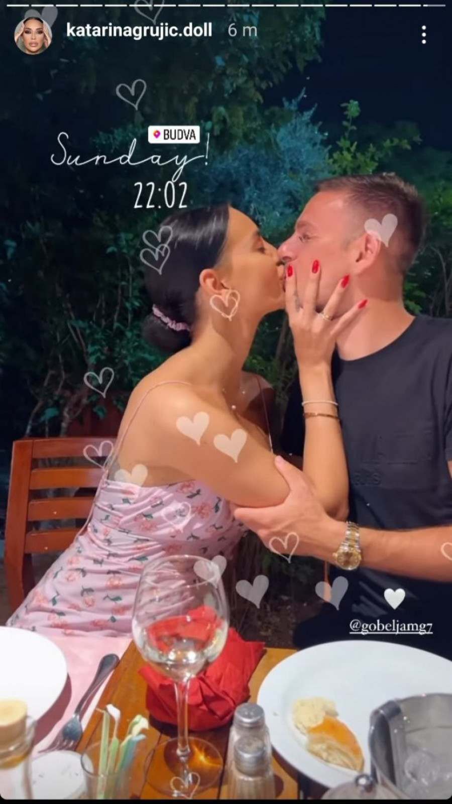 Kaća i njen suprug su te iste večeri izašli na romantičnu večeru, a Kaća je uspela da ovekoveči koliko joj je muž nedostajao tokom par dana koje su proveli odvojeno. Na snimku se vidi kako Kaća sočno ljubi Gobelju.