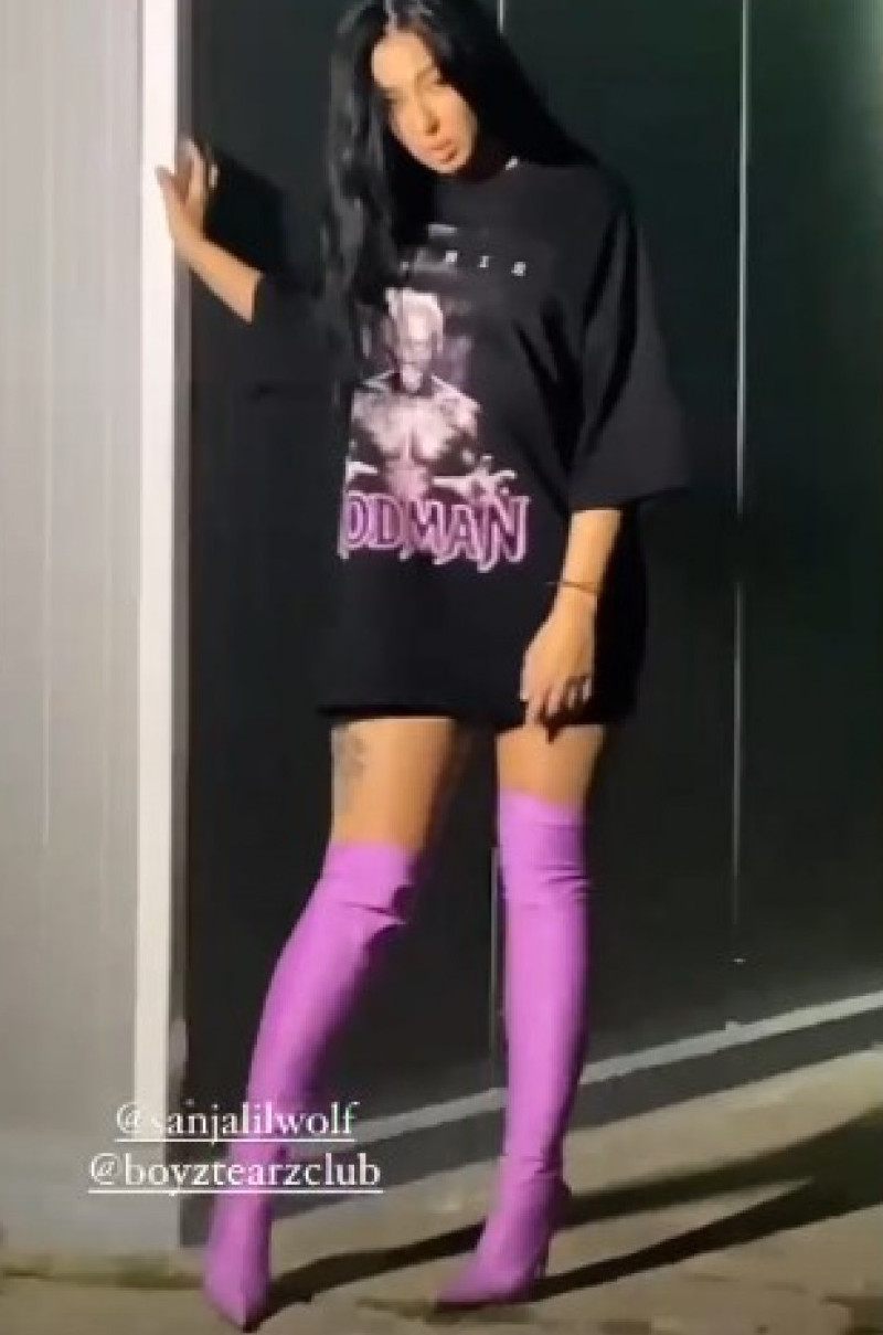 Pevačica je ovoga puta ponela crnu majicu popularnog naziva brenda, koja je nekada oslikavala muziku koju slušate, koja na njoj izgleda kao haljina-tunika. Sanja ju je uparila ni manje ni više već uz ljubičaste čizme. Čizme su u boji jorgovana i dosežu do polovine butina lepe Vučićeve.