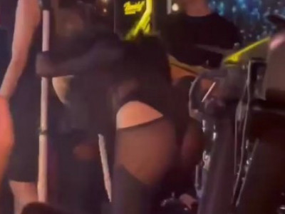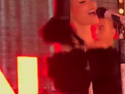 Pojavila se u bodiju koji je delom providan i maksimalno pozadi izrezan. On je bio bez rukava, a po dekolteu je bilo crno krzno. Crne duge rukavice su takođe imale taj detalj u vidu krzna ili perja koji je upotpunio kompletnu sliku. Dole je imala nešto između čarapa i helanki, budući da su neki delovi bili providni i od tila, dok su drugi bili u crnoj boji. Specifično je što je taj donji deo u vidu čarapa dosezao tek do kukova popularne pevačice, ali ne i preko, tako da joj je zadnjica bila cela otkrivena kao u kupaćem kostimu.