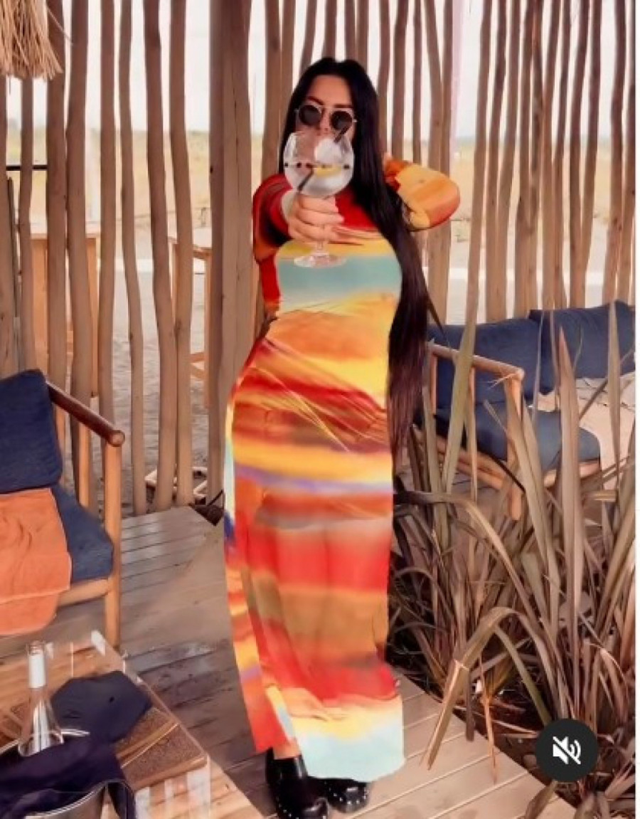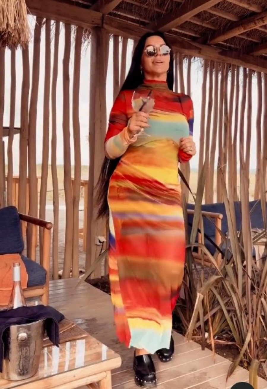 Aleksićeva je ponovo monotoniju sivila obojila u crno i zlatno, a i raspoloženje je na zavidnom nivou. Ona je objavila snimak na kome je u šarenoj haljini toplih boja. Haljina je delimično providna, gore je u vidu rolke, dok dole pada ravno. Pevačica je stajling upotpunila papučama visokih potpetica, dugu kosu je pustila da opušteno pada do preko pojasa, a ponela je i naočare u vidu neprevaziđenih lenolki.