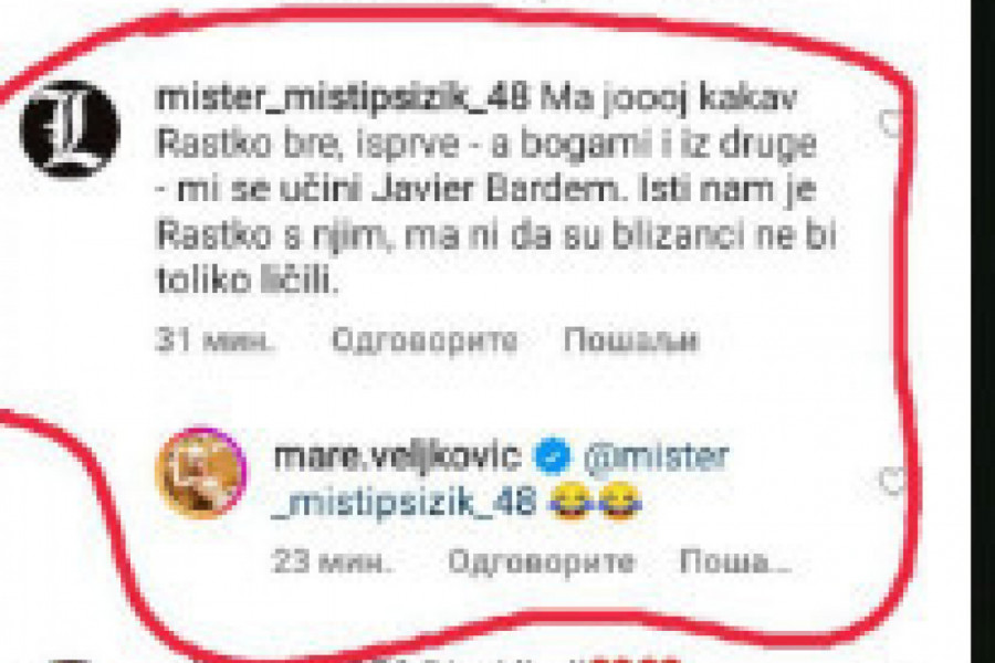- Rastko bre, isprve - a boga mi i iz druge - mi se učini Havijer Bardem. Isti nam je Rastko s njim, ma ni da su blizanci ne bi toliko ličili - napisao je ispod Marijine objave jedan njen pratilac.