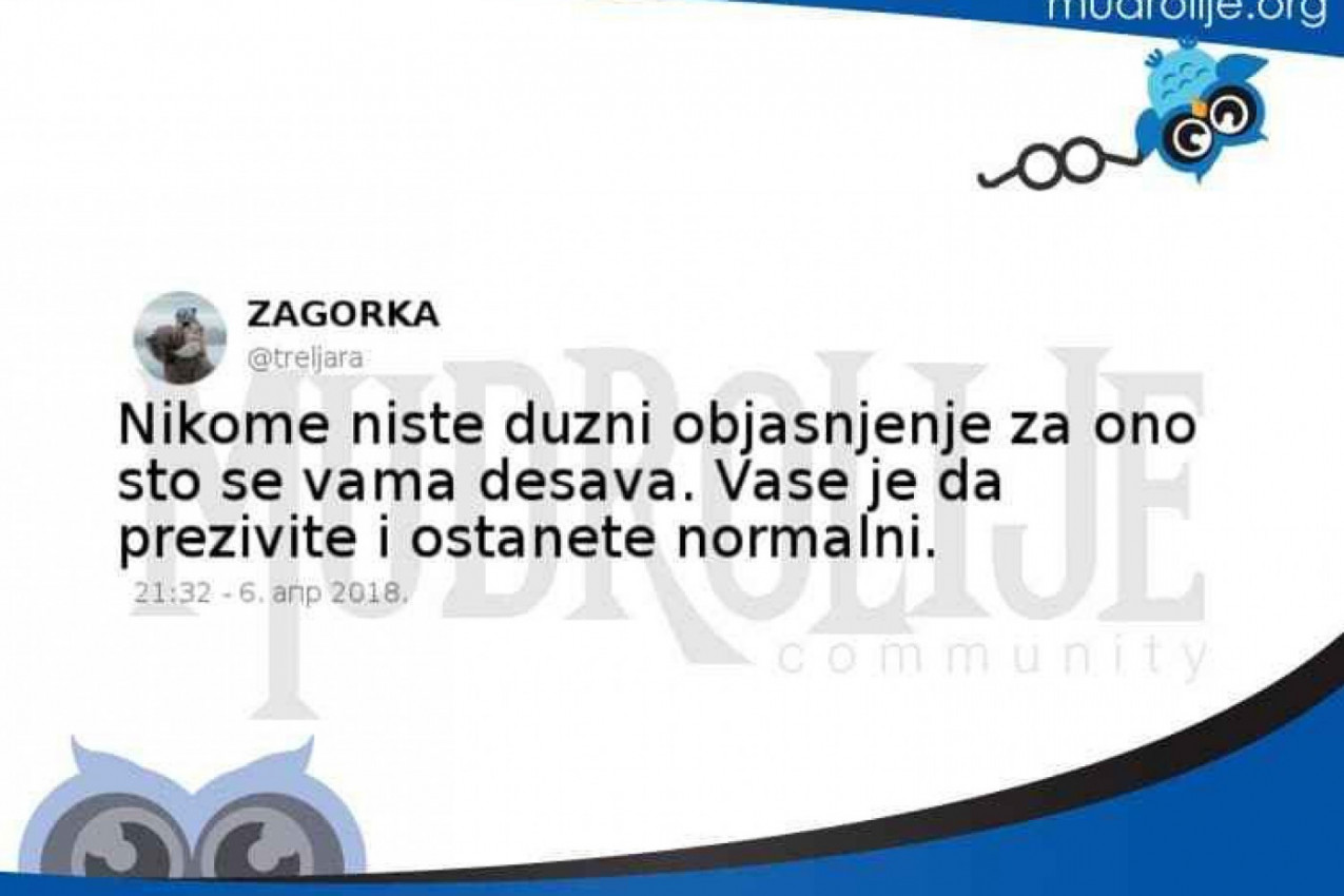 Ponekada ljudi idu totalno daleko da od vas traže objašnjenje za odluke koje se tiču samo vašeg života. Ljudi vole da znaju, da "ulaze" u tuđe živote, da se hrane vašom energijom, gaze po vašim lošim danima, a onda procenjuju i ocenjuju vašu sreću, zatim insistiraju da objasnite i istumačite sve što nije njihovo "ogledalo".