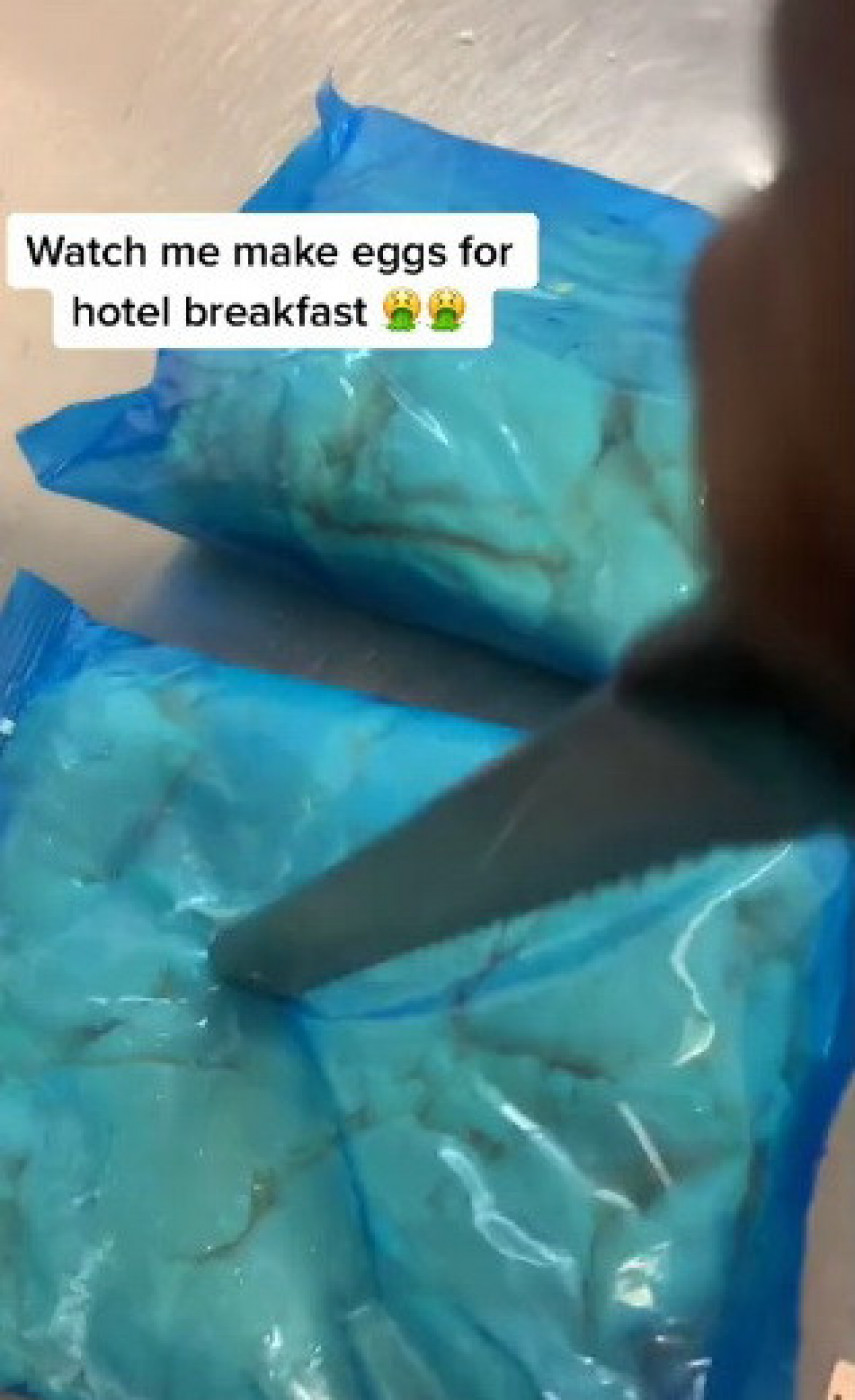 Tresi je snimku iz kuhinje nepoznatog hotela pokazala kako kuvarica umesto svežih jaja iz zamrzivača vadi plavu kesu u kojoj je već pripremljena smesa za kajganu.