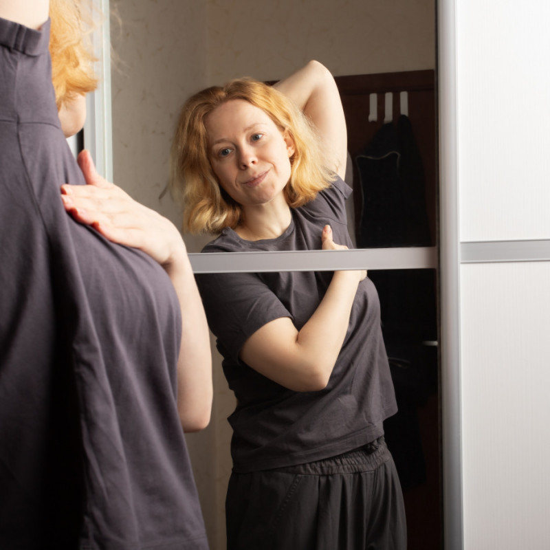 Ispred ogledala: Stanite ispred ogledala sa rukama spuštenim pored tela i vizuelno pregledajte svoje dojke. Obratite pažnju na promene u obliku ili konturi, udubljenja, otoke ili nepravilnosti na koži oko dojki, kao i na eventualne promene na bradavicama.