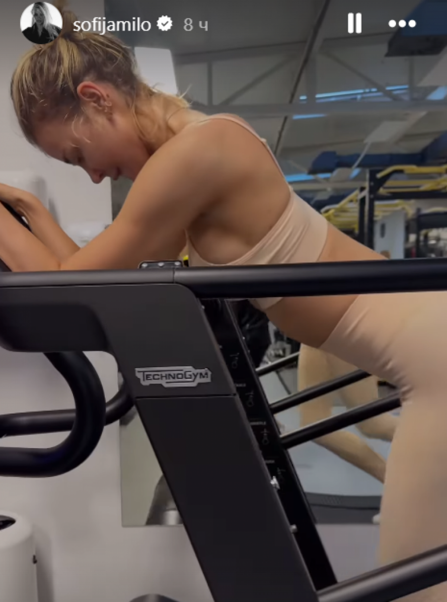 Nisu izostali ni čučnjevi koje je radila dižući jedan kraj tega. Primetno je da ju je trener snimao, budući da se njegov odraz video u ogledalu, a u tom trenutku je Sofija radila na traci, a koliko joj je bilo naporno svedoči i činjenica da je skinula majicu i ostala u malenom sportskom grudnjaku u istoj boji kao što su i helanke.