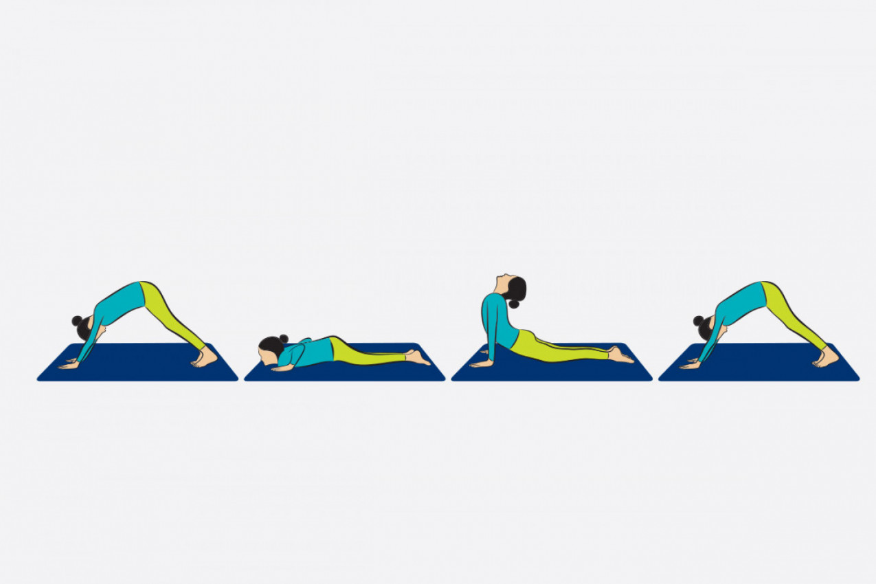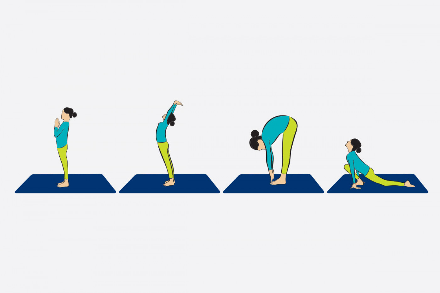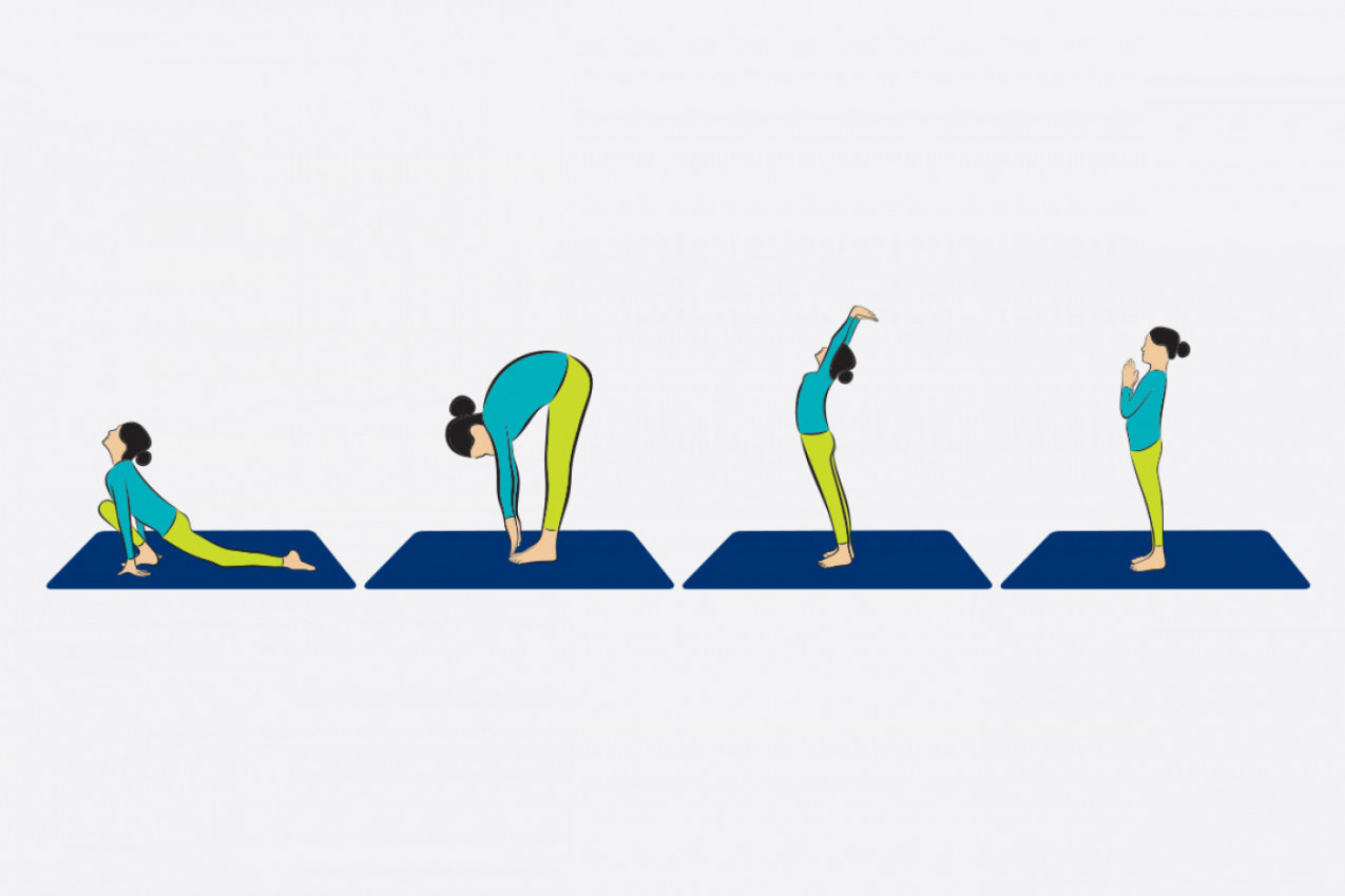Smenjivanje položaja: Udahnite i sa izdahom se ispravljenih ruku spustite u pretklon, odnosno preko stomaka i na kraju ovog segmenta spustite dlanove sa obe strane stopala. Ostanite u položaju nekoliko trenutaka. Zatim, desnom nogom iskoračite unazad, praktično do kraja prostirke koja je iza tela. Opustite zatim nogu i na nekoliko trenutaka spustite desnu nogu na koleno i ris. Zatim ispravite nogu u kolenu pa desnoj nozi pridružite levu i spustite se u plank, odnosno položaj daske. Nakon toga spustite se na oba kolena pa sedite na pete.